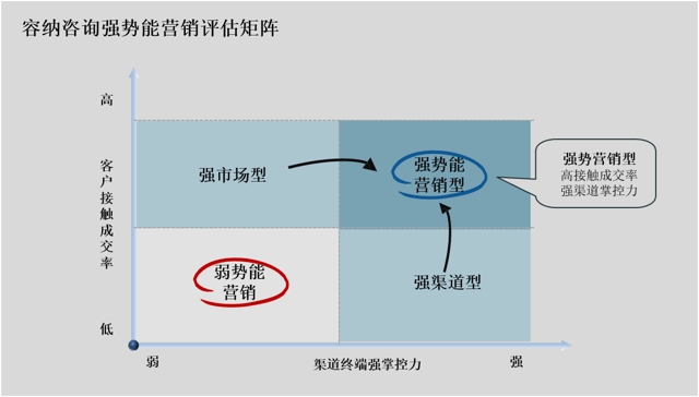 什么是“强势能营销”?容纳咨询认为:强势能营销有两个指标,一是厂家与渠道、终端强掌控力,二是对消费者的高接触成交率。