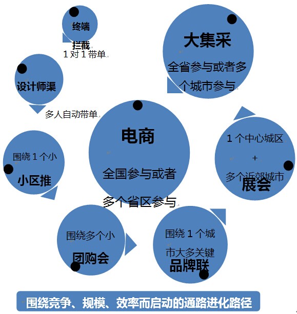 “大产业、大市场”吸引无数的商家投身其中,伴随整个产业的成长,竞争也日益加剧,尤其表现在通路上的竞争。因此整个通路模式也在竞争不断加剧的过程中不断进化。